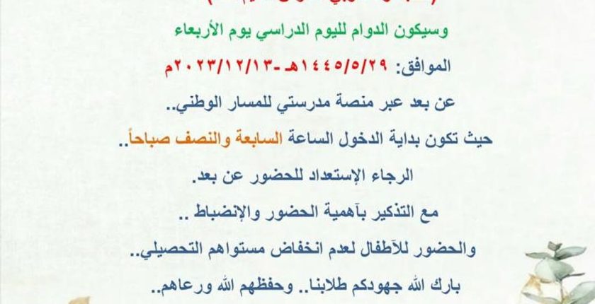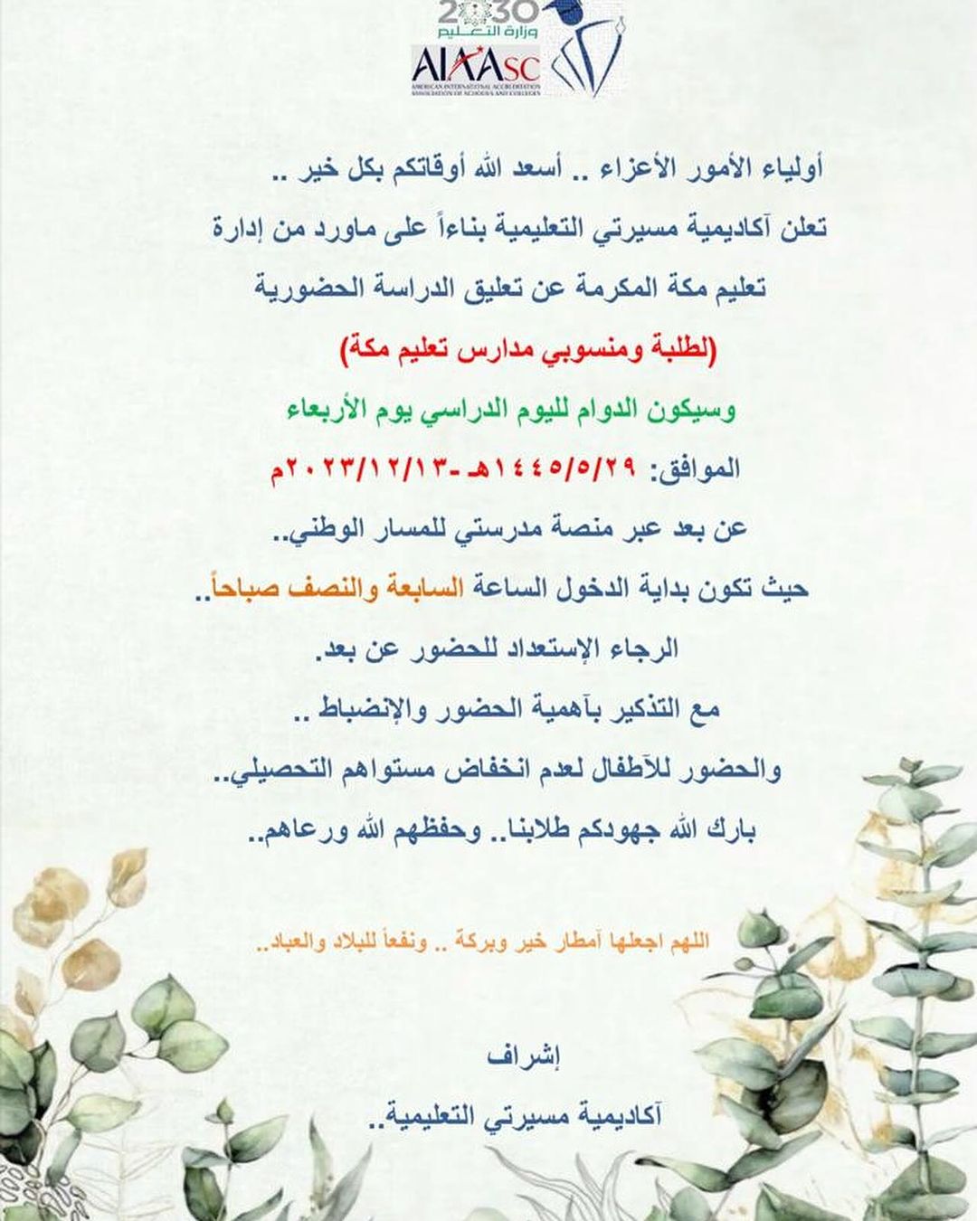 بناءً على التقارير الواردة من المركز الوطني للأرصاد، وحرصاً على سلامة الجميع؛ فقد تقرر تحويل الدراسة للفترة الصباحية ليوم غدٍ الأربعاء 29 / 5 / 1445 هـ عن بعد عبر في مدارس مكة المكرمة، الجموم، بحرة، الكامل.